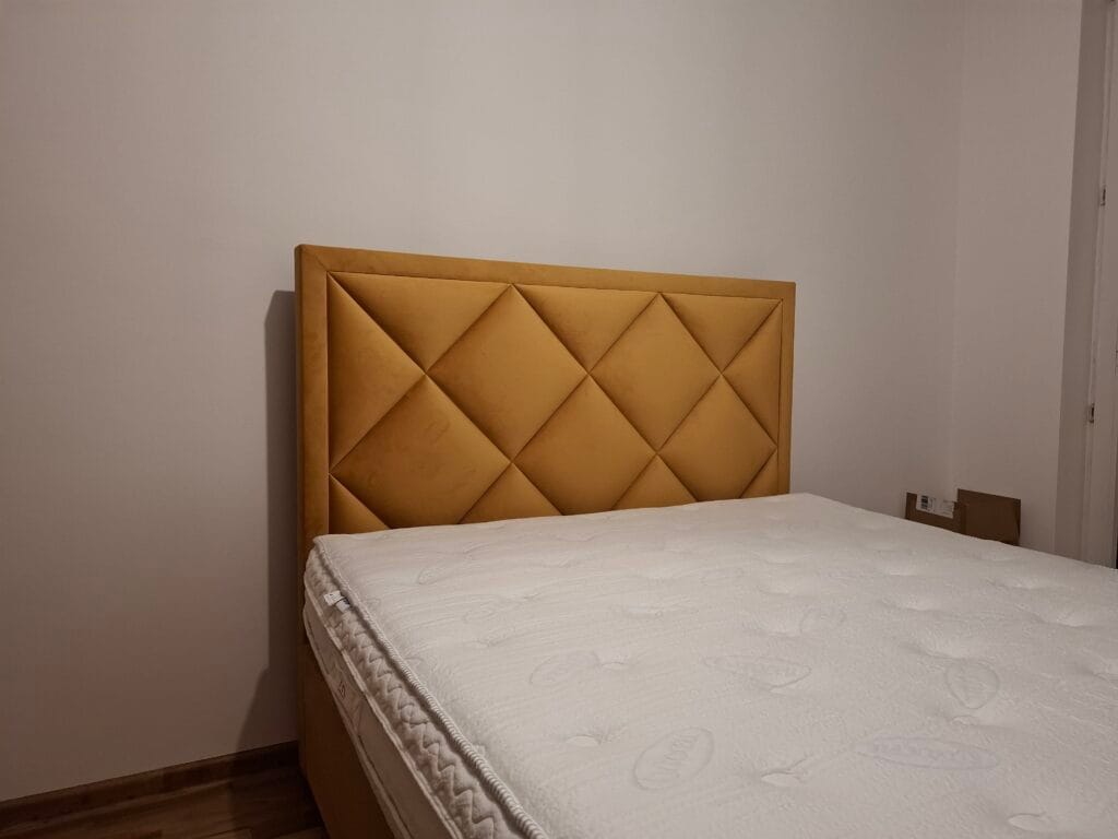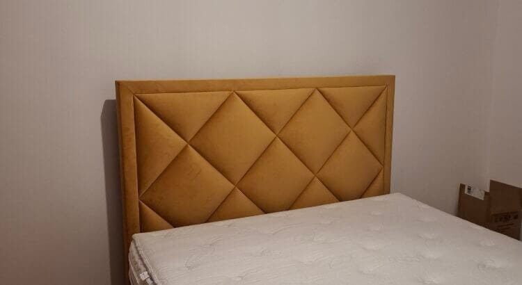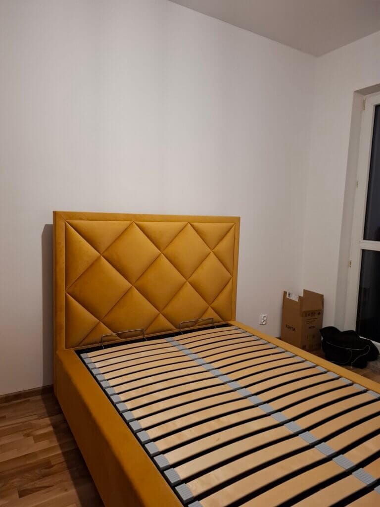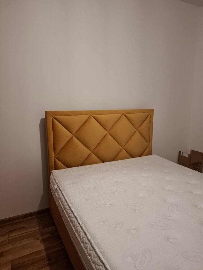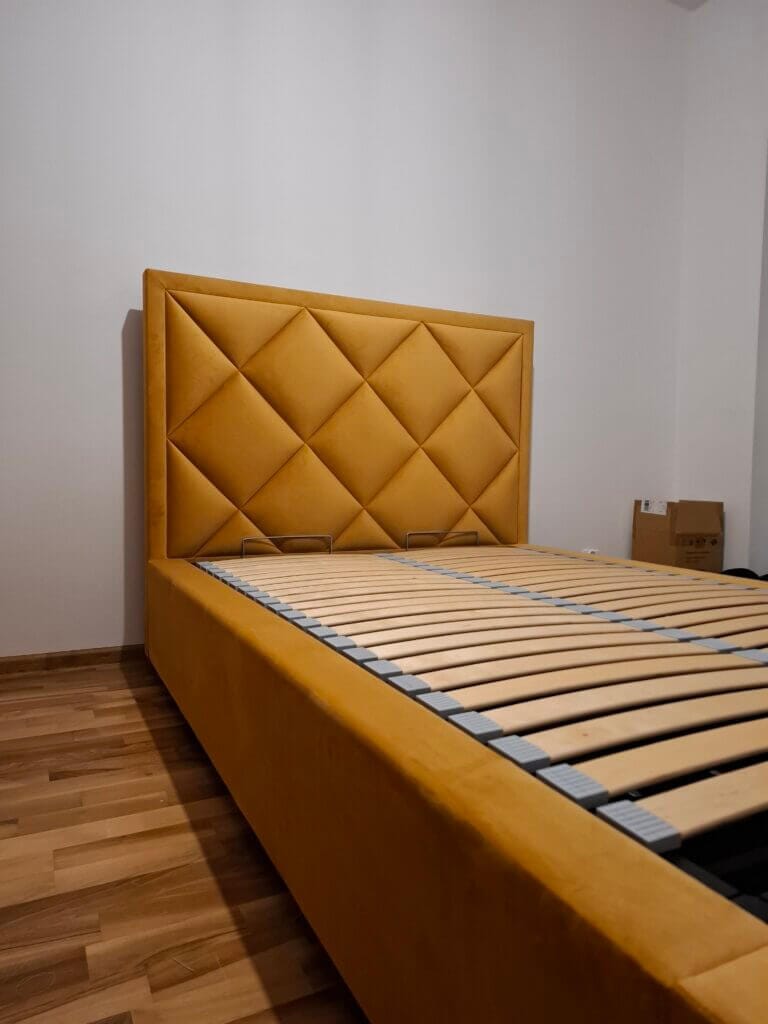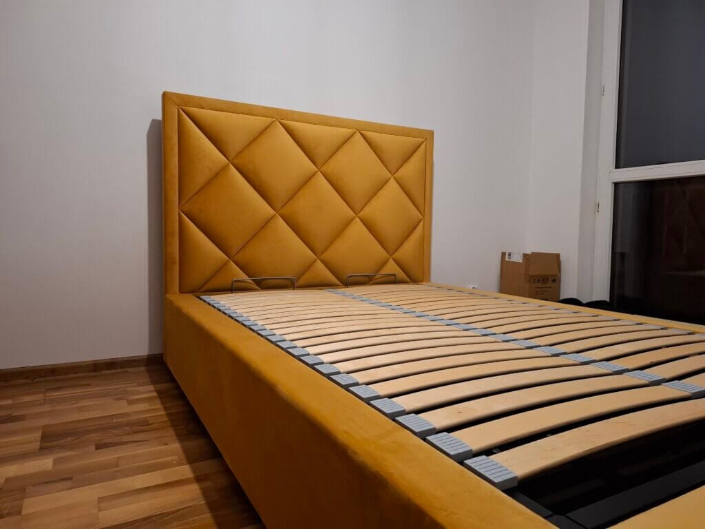Łóżko Modena charakteryzuje się wysokim wezgłowiem 115 cm, które zapewnia komfort podczas odpoczynku i relaksu. W tej realizacji zastosowano nogi drewniane o wysokości 5 cm w kolorze naturalnym, które w połączeniu z tkaniną Magic Velvet 2215 Toptextil (kolor złoty) nadają łóżku przytulny i elegancki wygląd.