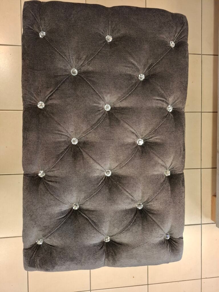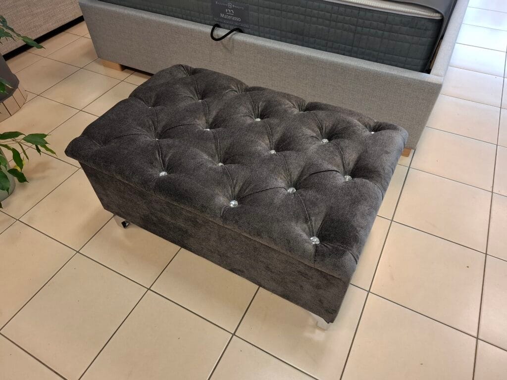 Zastosowana tkanina Milton New 15 doskonale podkreśla strukturę pikowania, a jej trwałość i miękkość czynią skrzynię idealnym dodatkiem do codziennego użytkowania.